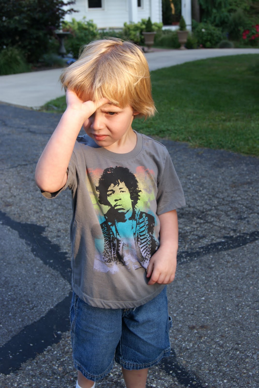 I can totally relate, I just sent my 5 1/2 year old off to kindergarten and it was almost too much for me! : ) This parenting thing is not easy, huh? Your little guy sure is cute and I love his Jimi Hendrix t-shirt!